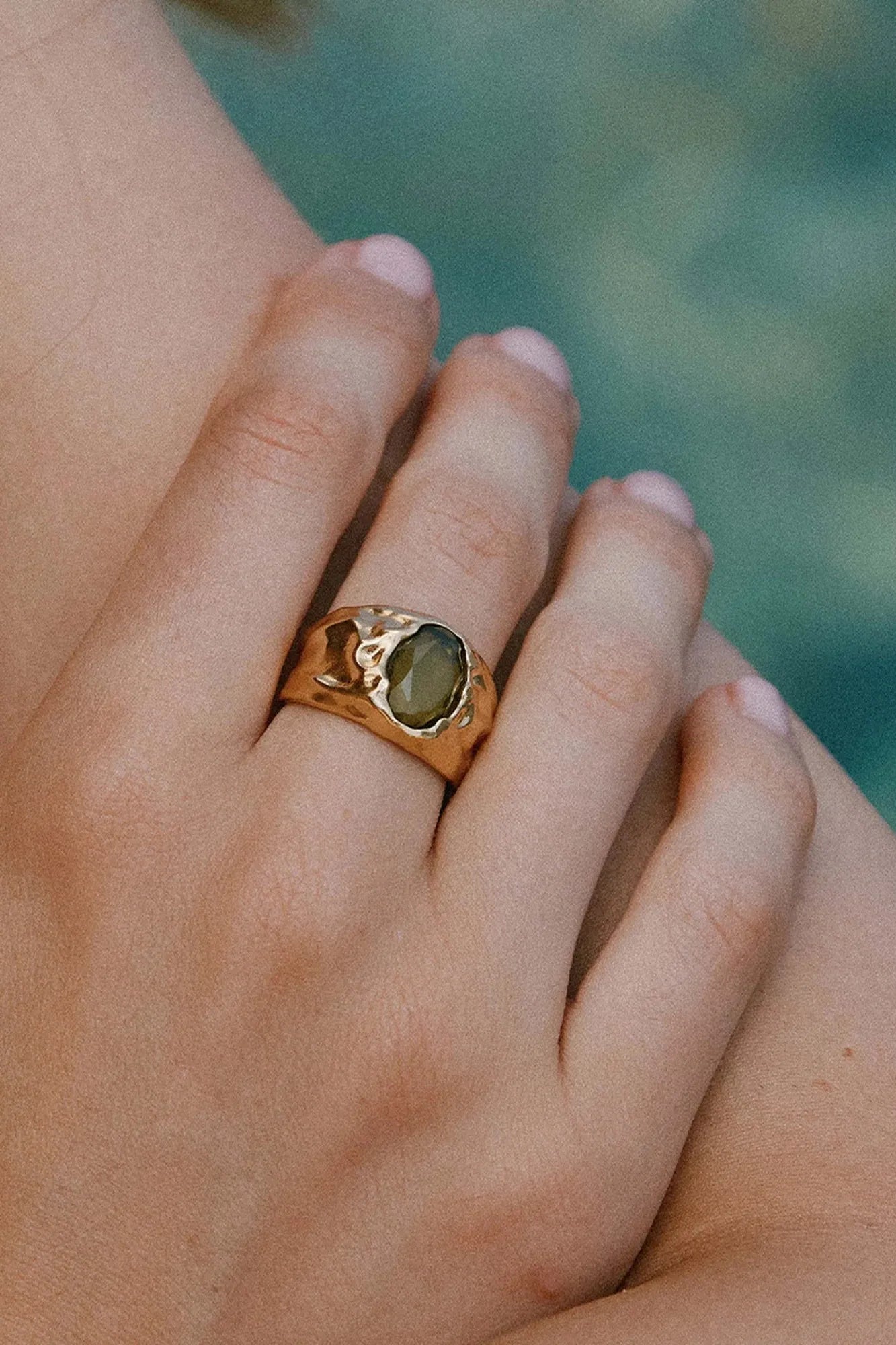Carmen is a wide-band ring with a hammered surface and a deep, faceted colored stone set into raw, textured gold. Its irregular finish highlights the contrast between metal and stone.