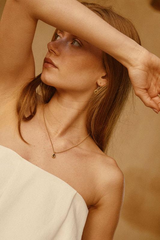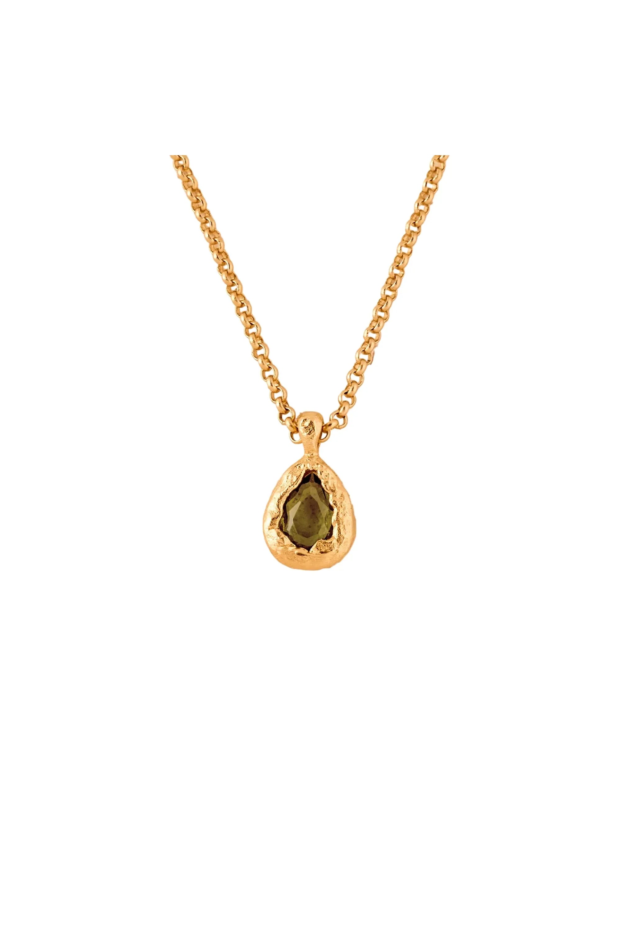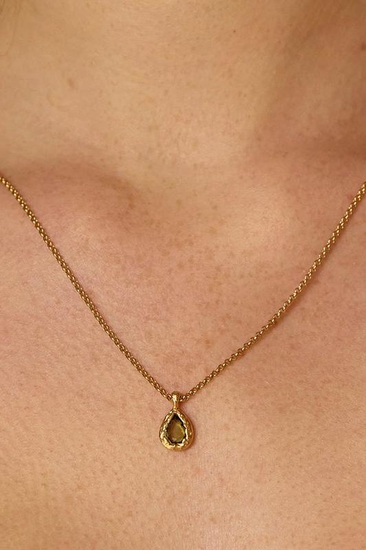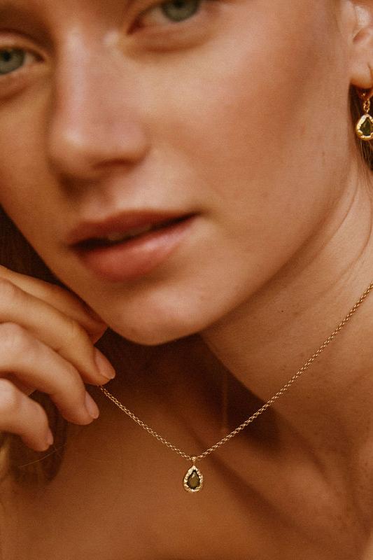 Like a drop of shaded water, set in a textured gold nest, the dainty dark green stone of the Lysia necklace catches the light.