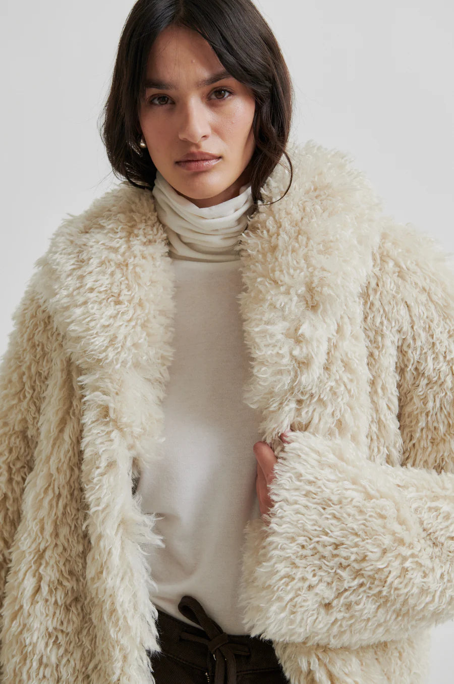 Second Female shaggy jacket. The jacket is made in an ultra-soft fabric with shaggy, sheep-like texture. Featuring a concealed hook and eye fastening at the front and two concealed pockets. Fully lined. Regular fit with relaxed, slightly boxy silhouette.