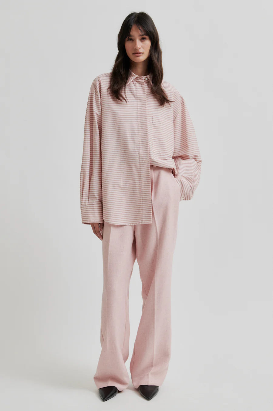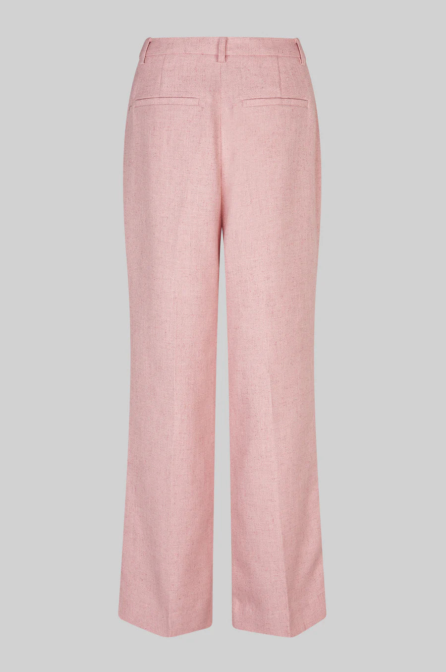 Second Female wide-leg trousers. The trousers are made in a melange fabric with linen quality. Featuring a concealed zip, hook and button closure, two front pockets and decorative back pockets. Pleats at waist. Mid waist with wide, straight legs.