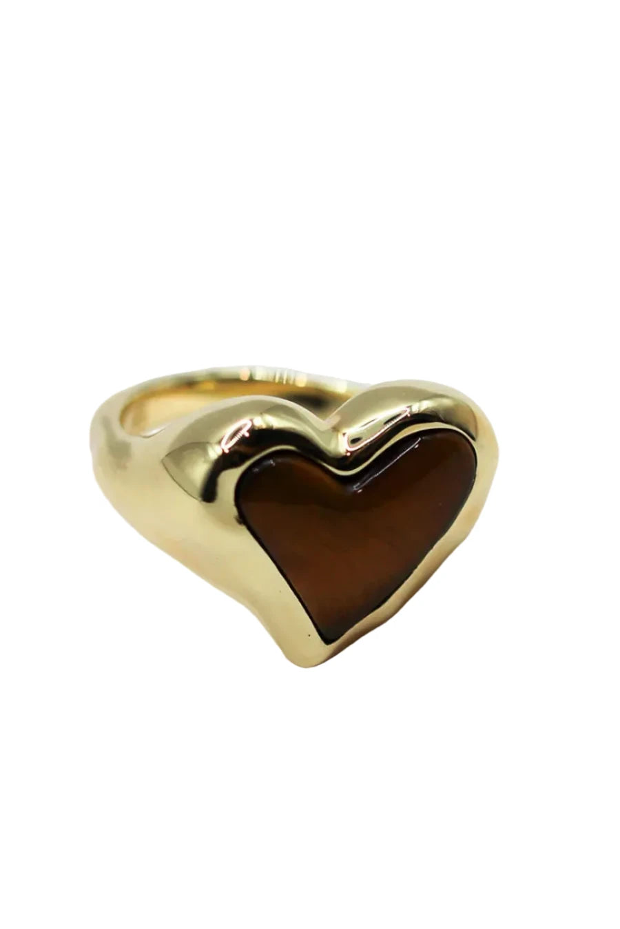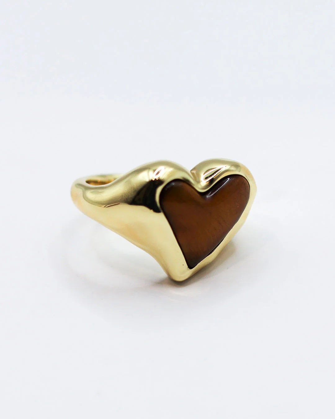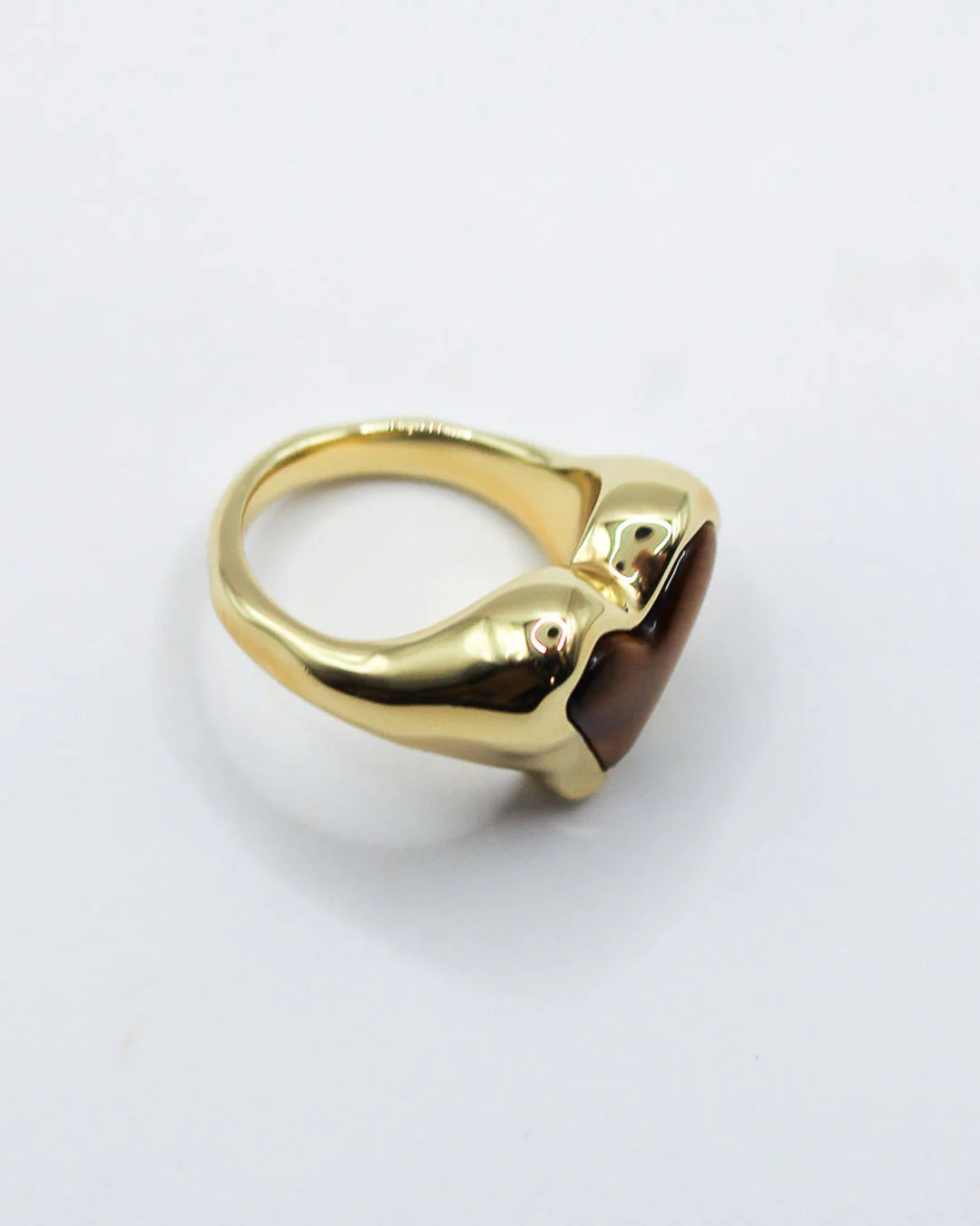 Our Whitney Heart Signet Ring has been a signature style of F+H Studios for almost a decade. We have now refreshed the design with a modern aesthetic, featuring softly hammered metal and a cabochon cut natural tiger's eye gemstone that is set flush within the bezel of the ring.