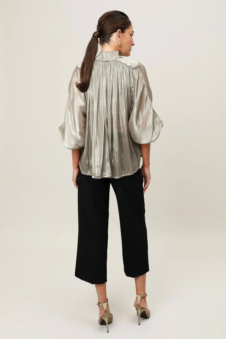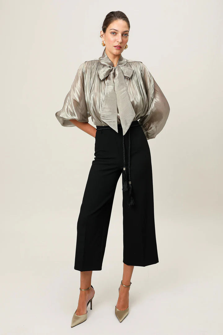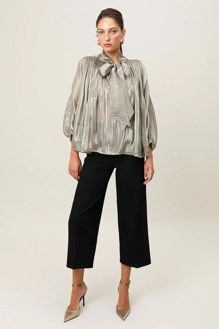 The Atelier Bow Top invites a soft sense of drama into everyday dressing. Crafted from a semi-sheer, delicately textured Japanese satin, featuring an adjustable neck tie and shoulder panels framed with piping detail. Softly voluminous 3/4 sleeves, elasticated cuffs, and gathering through the front and back bodice create a fluid drape that moves with ease. Designed with soft volume and considered structure, the Atelier Bow Top blends modern femininity with contemporary refinement.
