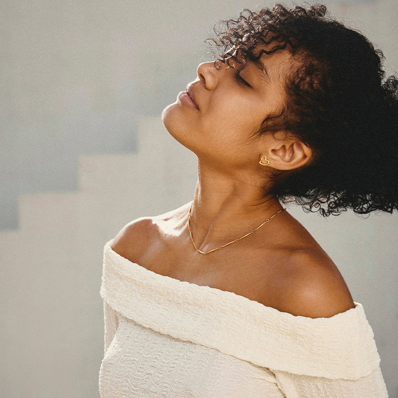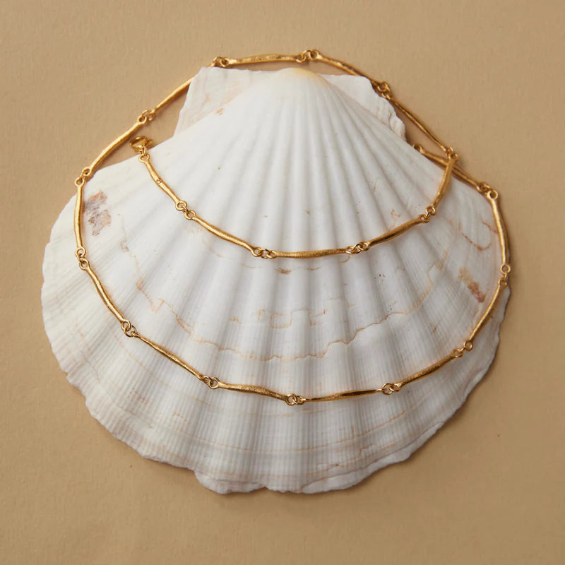 Enea is a slim articulated bar-chain necklace, with hammered and irregular bar-shaped links. Wear it alone, or layered with longer necklaces.