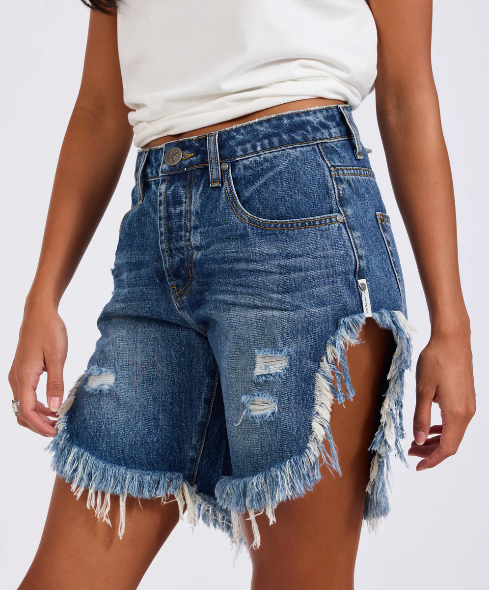Frankies High Waist Long Length Denim Shorts - Blue Love