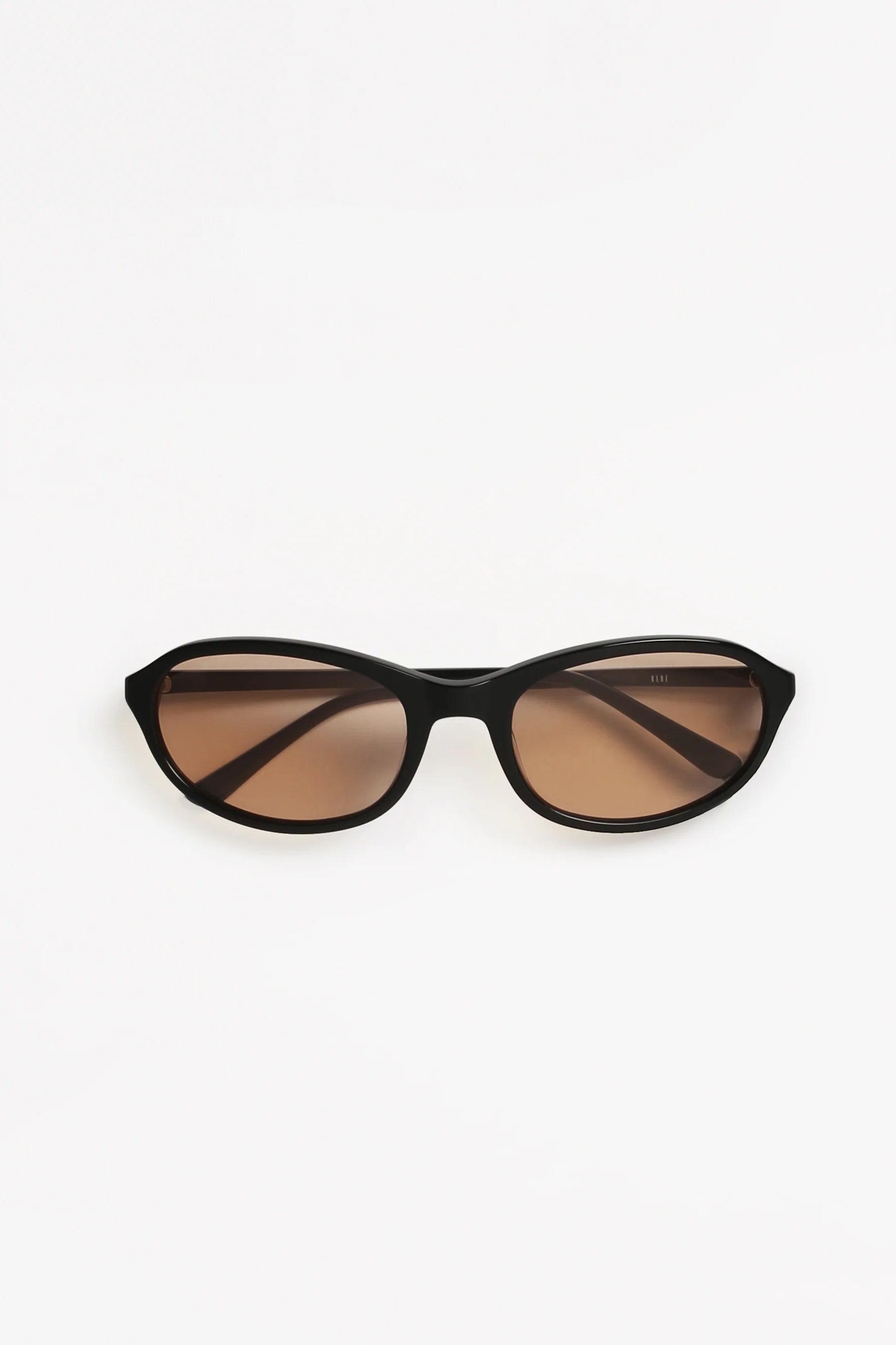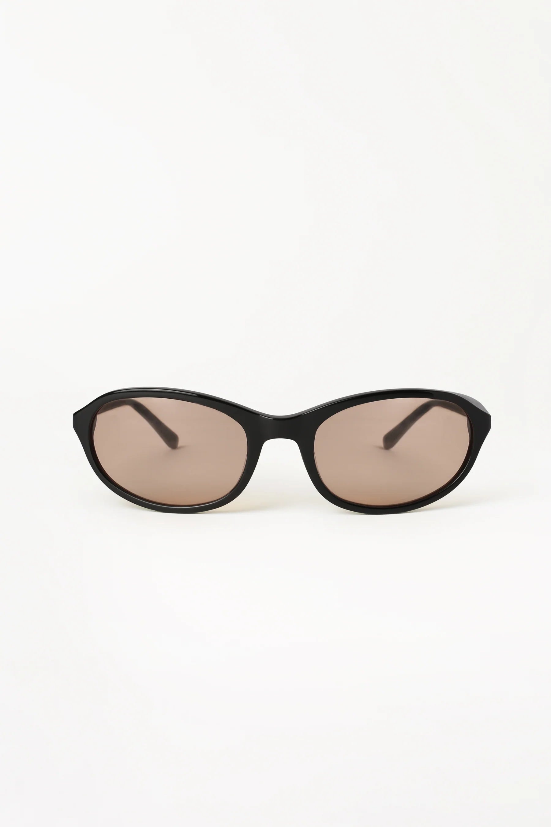 Rounded wrap shaped tinted sunglasses featuring slim black frame and peach lenses.