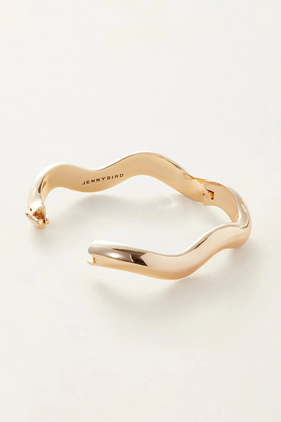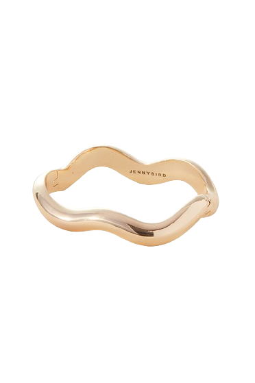 A bold, curvy bangle that makes a major statement. For double the curves, stack with another Ola Bangle, or mix in a silver version for a two-tone effect. This high polish bangle opens and closes with a hinge and tab lock closure. Listen for a "click" to ensure tab is locked properly. Note: this design wears best when the closure is secured on the inside of your wrist. Finished in high-polish gold.