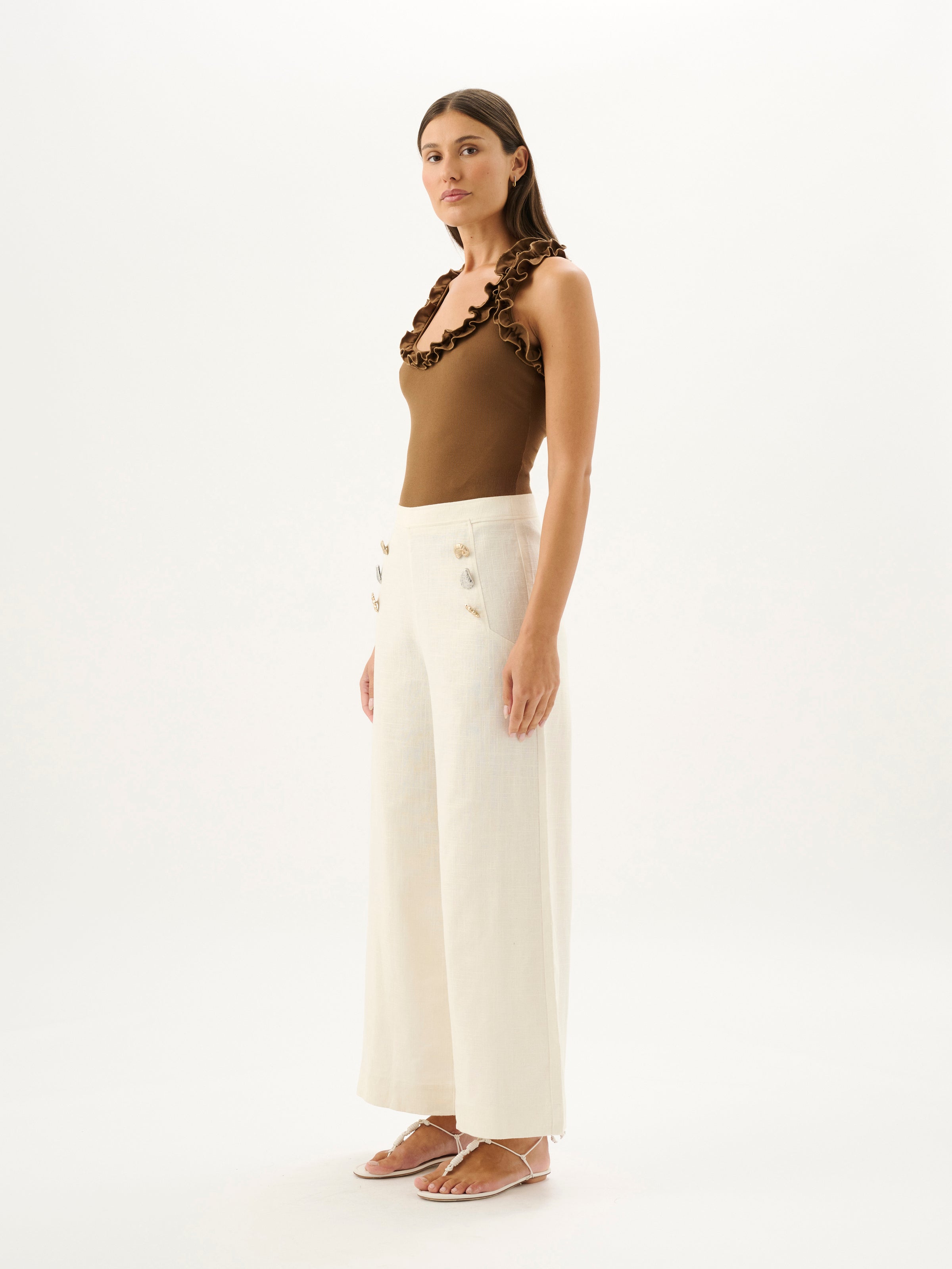 The Odessa collection whispers tales of sunlight chasing the horizon across ancient European fishing ports, where maritime heritage celebrates the timeless dance between humans, sea, and sun. Hand-painted prints transform fishing nets into elegant lattice overlays, waves into rhythmic motifs, and sun-dappled waters into sophisticated ombré effects—all rendered in a kaleidoscopic palette where sun-bleached neutrals meet maritime blues and unexpected sunset accents. Diaphanous fringing and luminous sequin work mirror the hypnotic dance of light on water, while intricate starfish crochet patterns emerge like treasures discovered at low tide. Odessa carries a gentle rhythm evoking a sense of adventure and exploration that feels both nostalgic and fluid, much like the maritime world that inspires the collection.