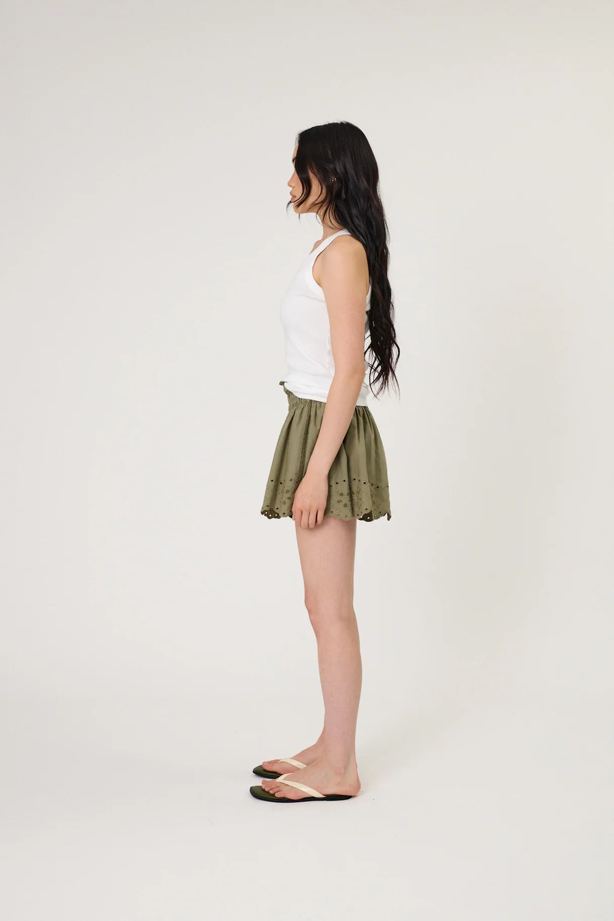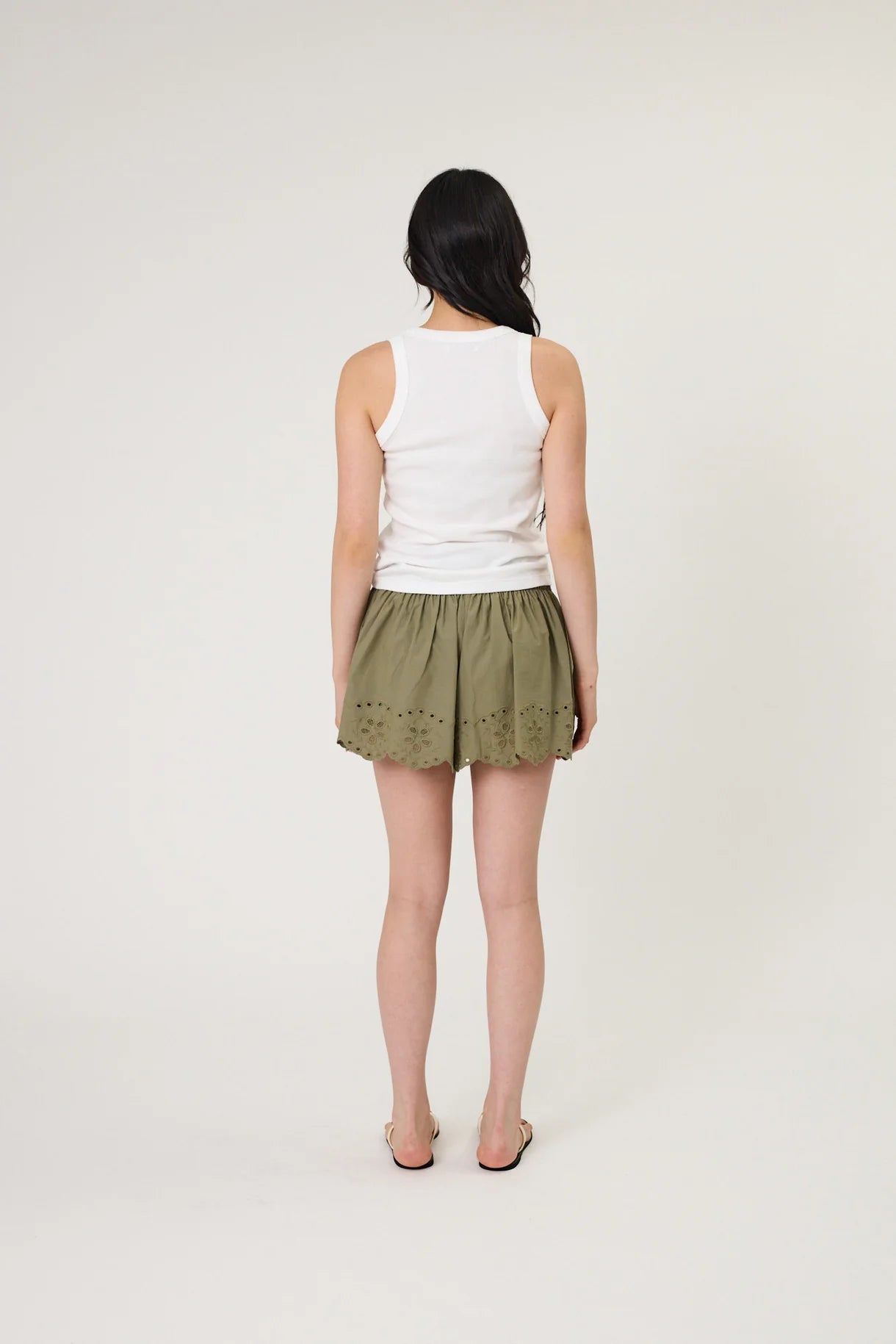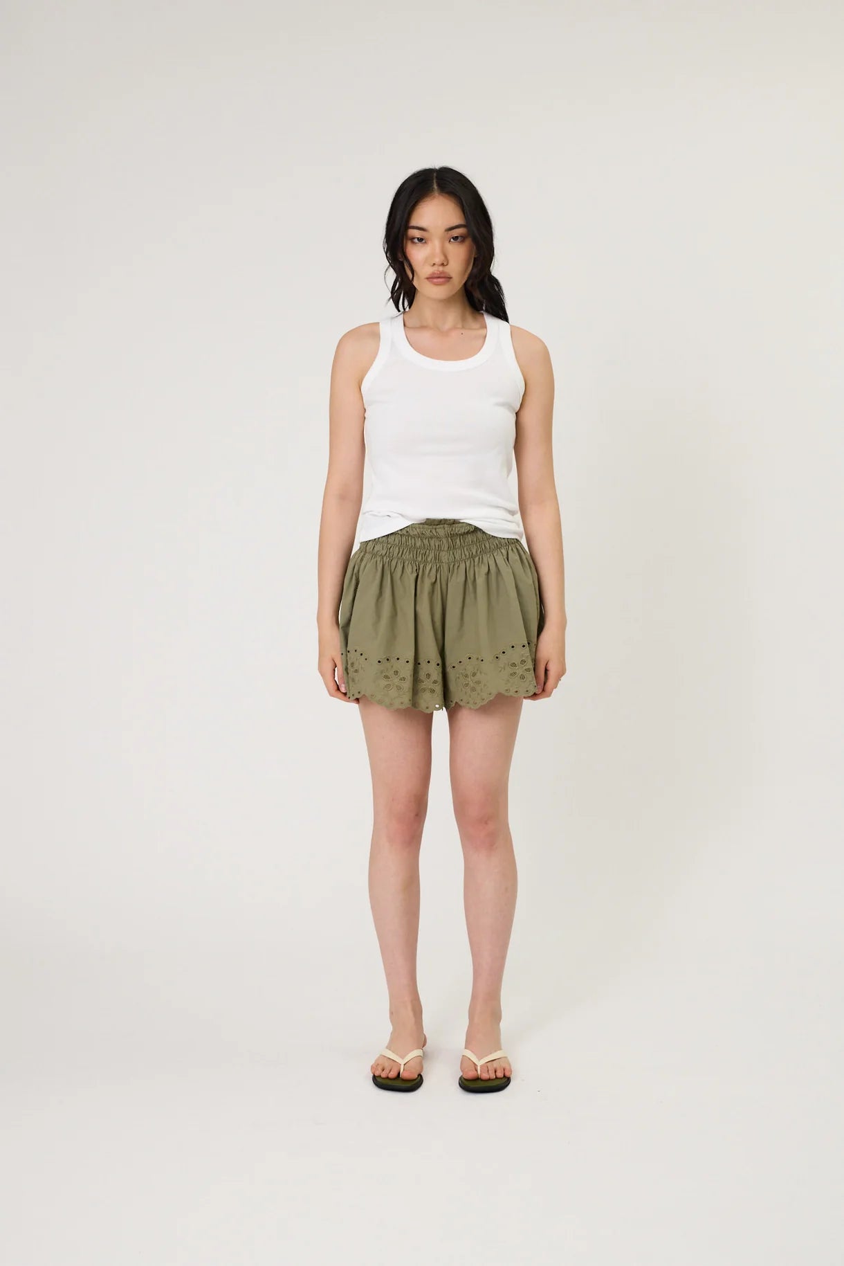 The Bella Shorts are constructed with a scallop broderie hem for a feminine touch. Made from 100% cotton, light, breathable and fit for lounging, or paired with the a classic tank for an effortless summer look. Also available in Cloud.