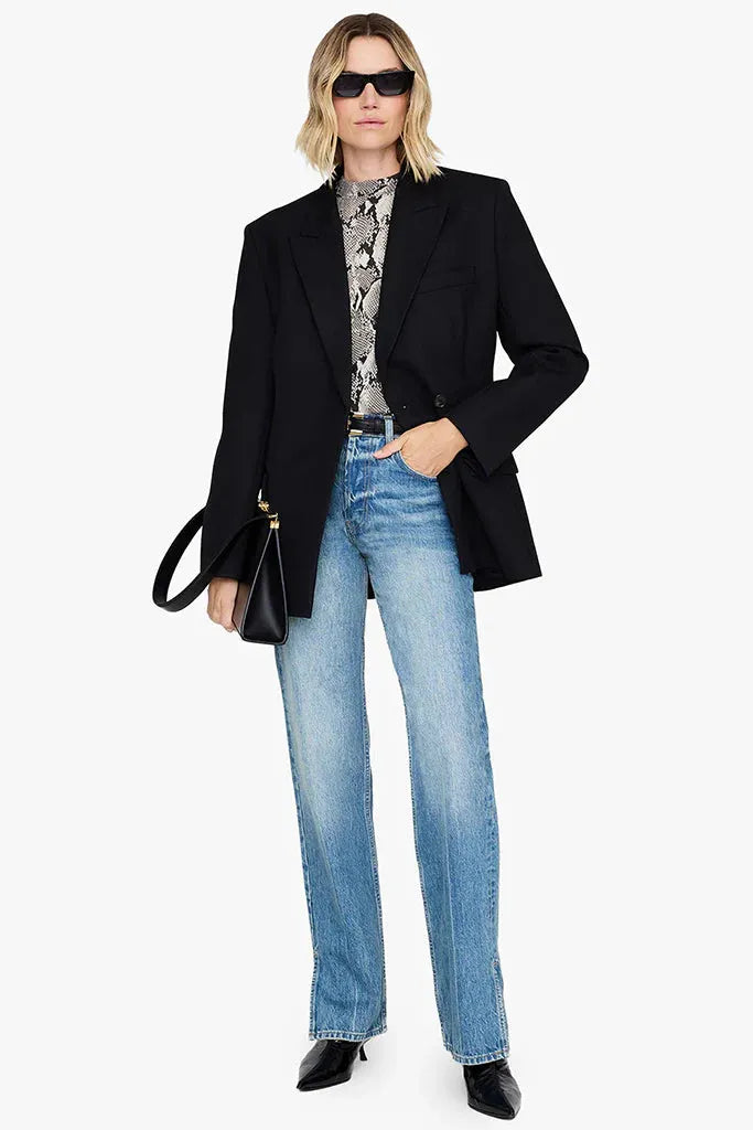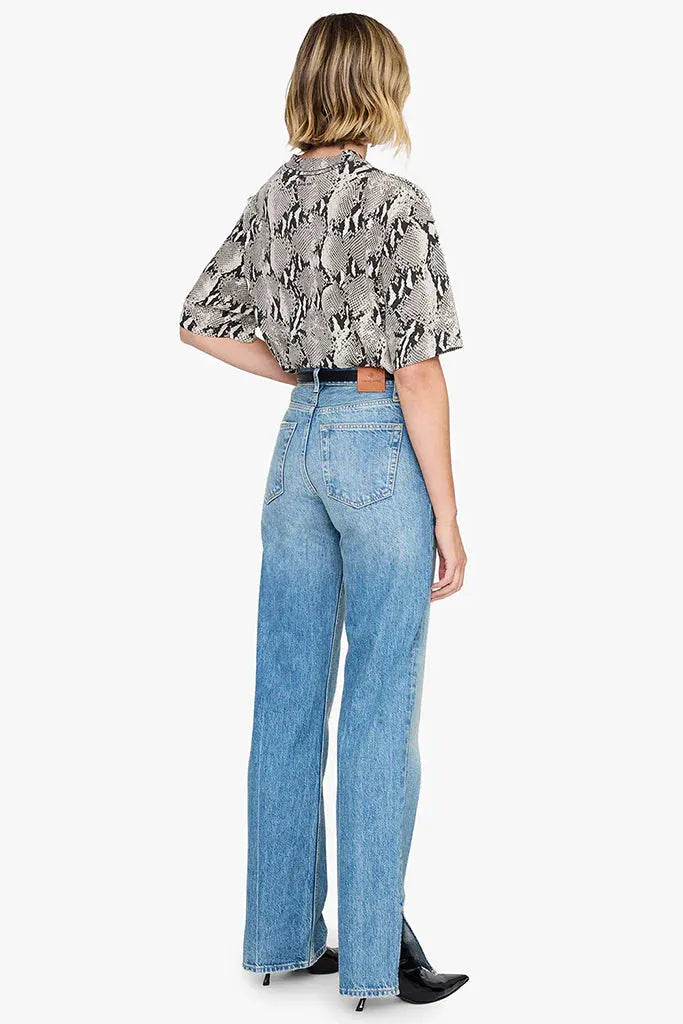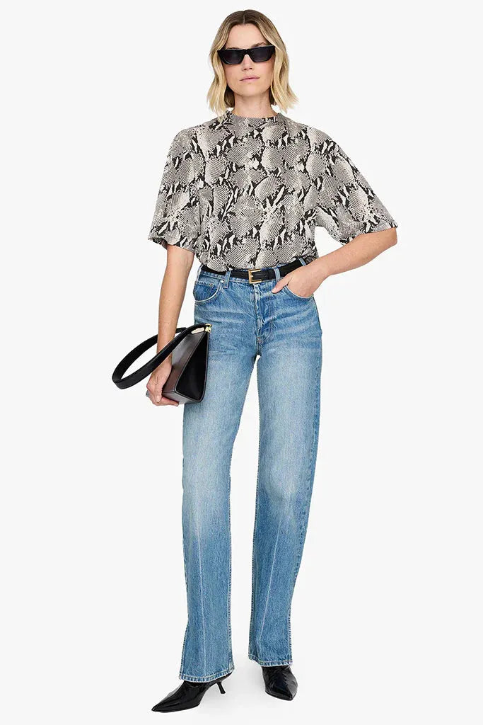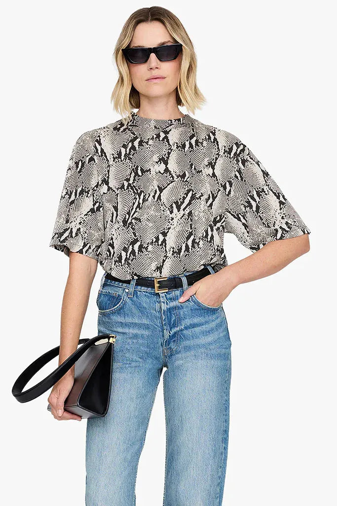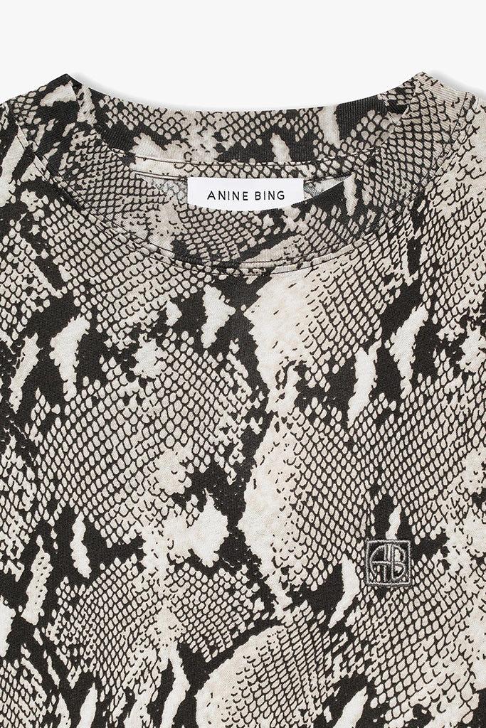 An oversized, boxy T-shirt crafted from lightweight 100% cotton jersey, featuring an all-over washed python print. Designed with a relaxed fit, it is finished with a grey ANINE BING framed monogram embroidered at the wearer’s left chest.