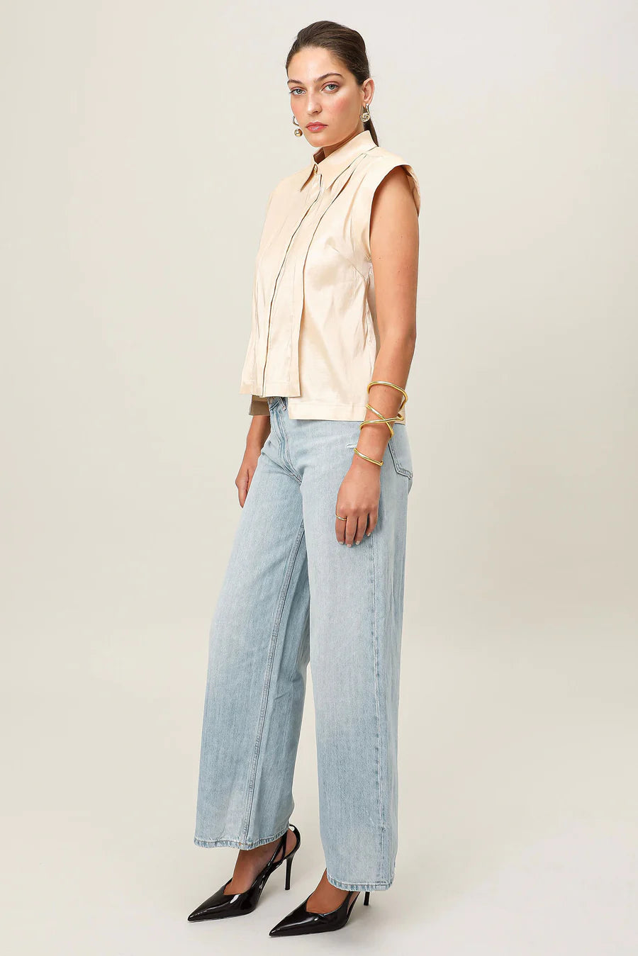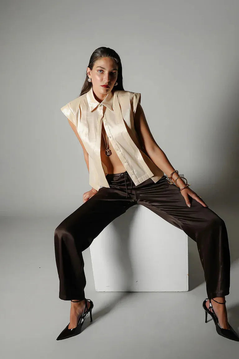 A piece that balances sculptural strength with refined minimalism. The Sol Verite Shirt is cut from luminous taffeta material, featuring subtle shoulder pads and front flange pleats that create Realm Origin's signature sharp, tailored fit. A concealed front button closure, step hem and back vent introduce ease and movement, softening the structure. The result is a piece that feels strong, feminine, and distinctly modern.