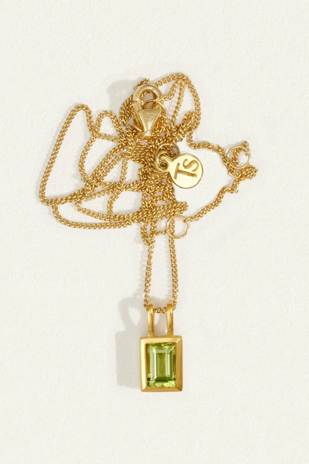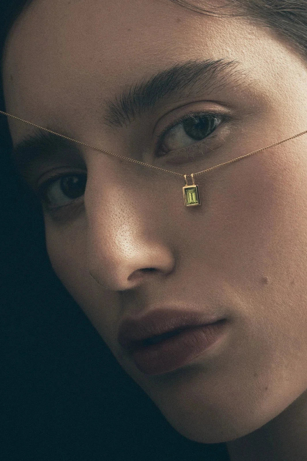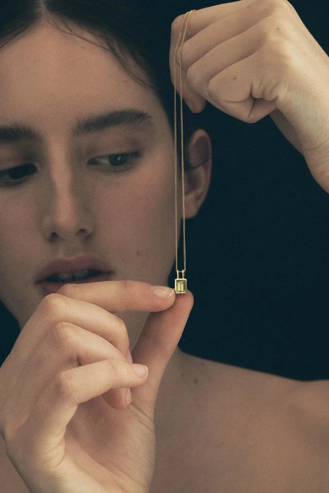 The Eden Necklace in 18K Gold Vermeil is verdant baguette cut, bezel set peridot suspended by a double bail on a fine curb chain. Peridot stones were revered by the Ancient Greeks and Egyptians as a symbol of the sun, radiating warmth, positivity, and creativity.