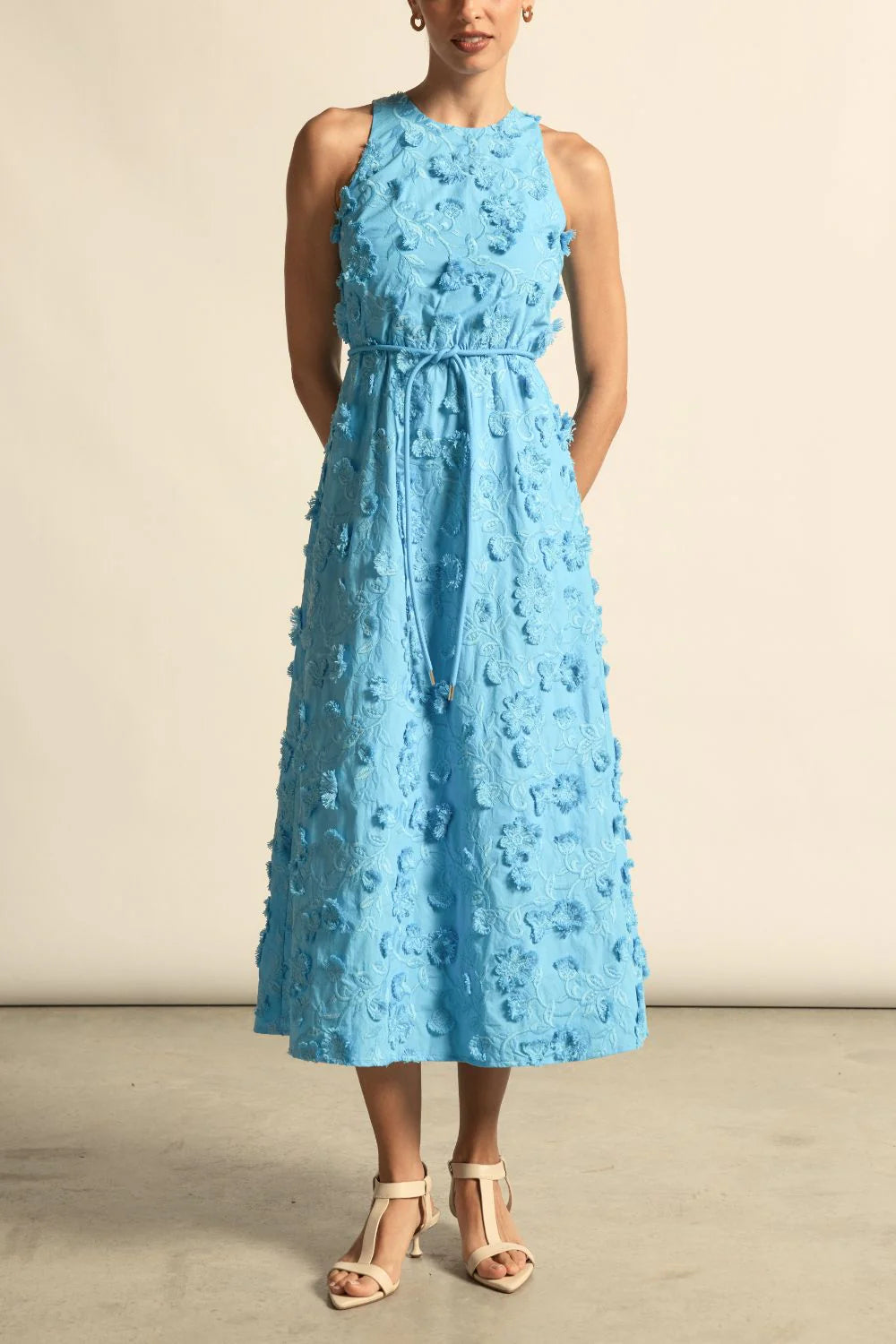 the dusk dress is shaped with a high rounded neckline and sleeveless fit-and-flare profile. a waist seam with a self-tie belt refines the shape, while a midi length adds polish to everyday outfitting. finished with an invisible zip and covered button closure at the back, it’s a modern piece designed for versatility.