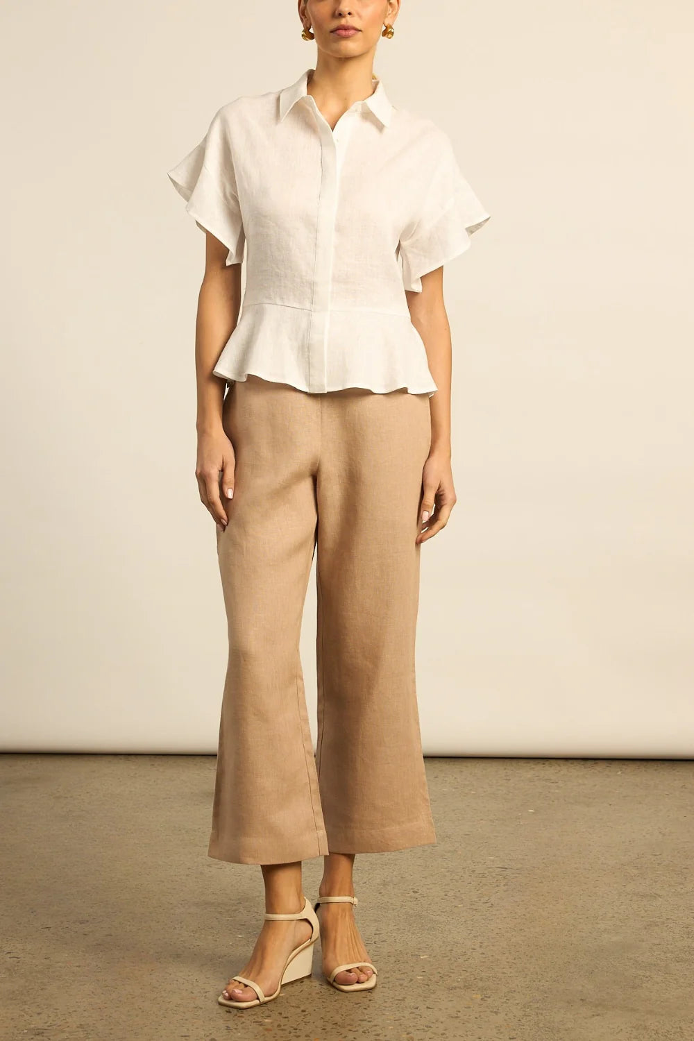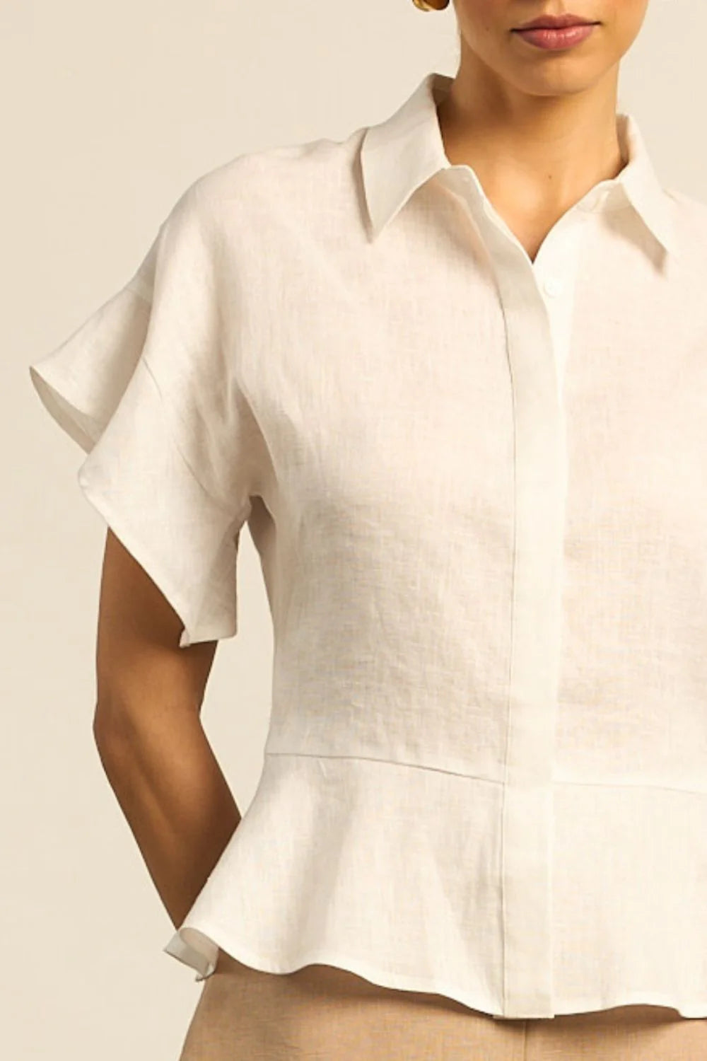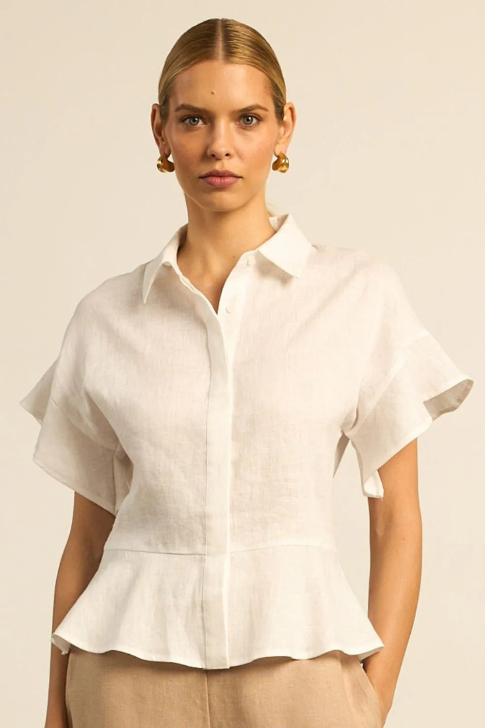 featuring dramatic flutter sleeves and a semi structured peplum shape. porcelain shell buttons are concealed beneath a covered placket, keeping the focus on proportion. contemporary yet highly wearable, it’s a versatile piece designed for elevated everyday dressing.